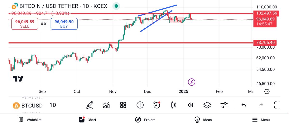 طبق چیزی که بنده تحلیل کردم ما یه کنج صعودی داشتیم که ناحیه شکسته شد رو به پایین و ریزش داشتیم تا ناحیه ی 92 و دوباره قیمت برگشت پولبک زد به نقطه ی بریکون یا همون نقطه ای که قبلاً شکسته شده بود و تاییدیه ی خودش رو هم برای ریزشی شدن داد تا همون ناحیه ی 92 هزار تا که تارگت یا هدف اول هست و چنانچه یه زیر این ناحیه بیاد و شرایطش فراهم بشه براش تا 73 هزار تا خواهیم ریخت