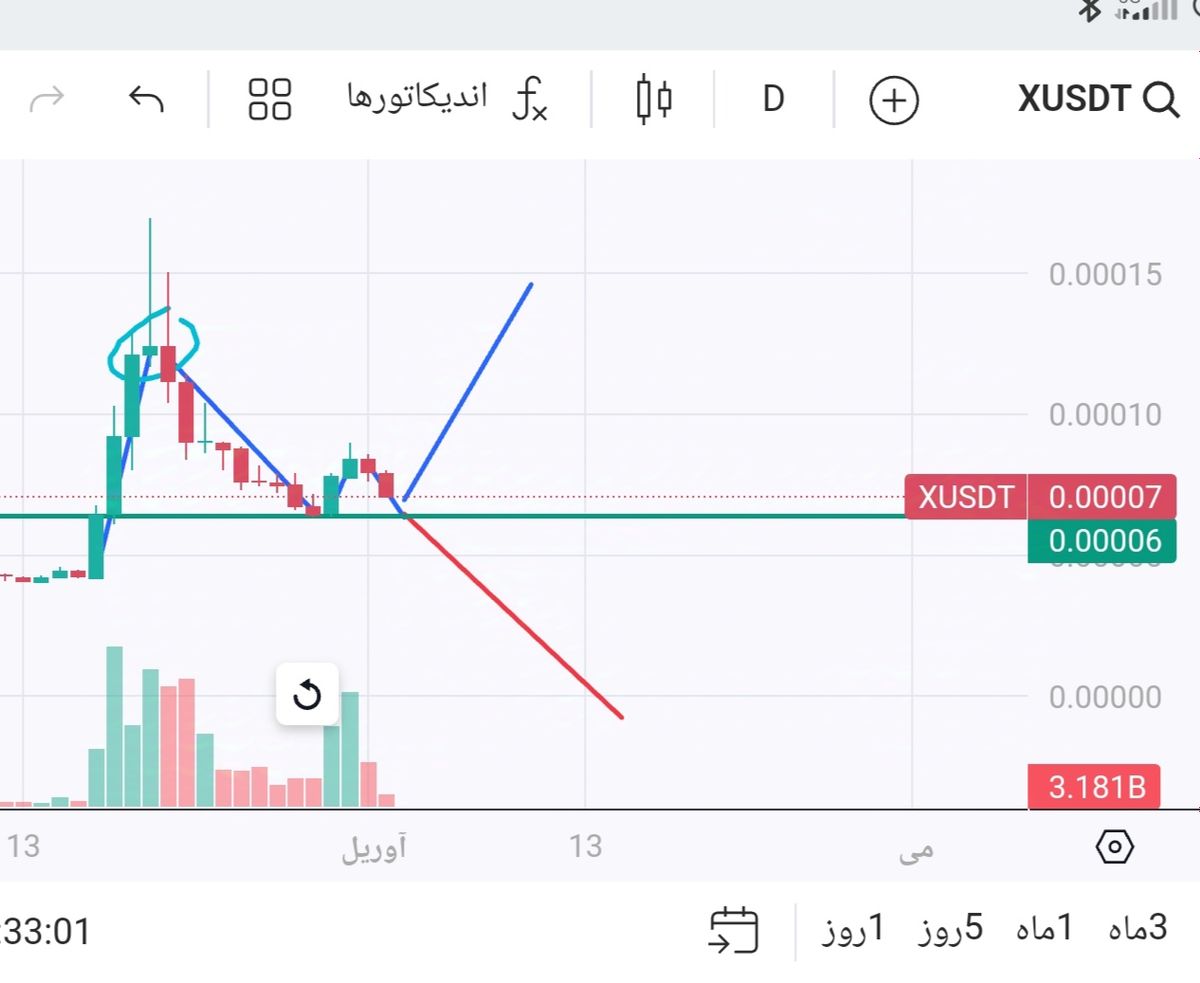 در تایم فریم روزانه کندل همر دیده میشه و روند نزولی اتفاق افتاده در حال حاضر دو حالت ممکن است اتفاق بیوفته یکی اینکه ریتست همون کندل نزولی هستو در ادامه ممکن است بیشتر ریزش کنه و در حالت خوشبینانه الگوی سر و شانه تشکیل شه و تا محدوده ی 0.00015رشد کنه و فقط با صبر مشخص میشود کدام یک قراره اتفاق بیوفته