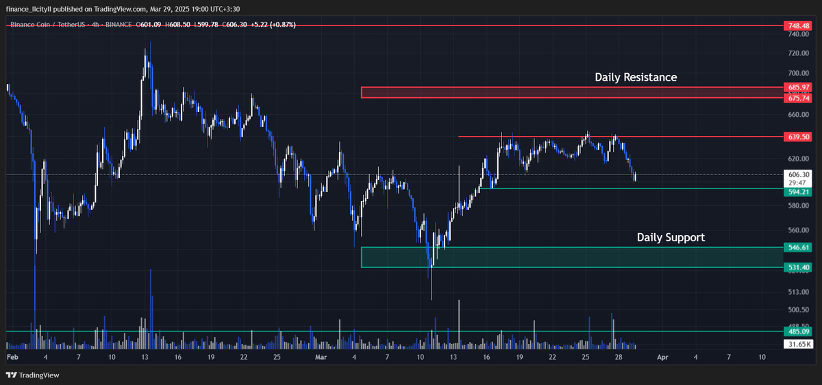 قیمت در حال حاضر در یک کانال رنج فشرده میان ۵۹۵ دلار و ۶۴۰ دلار گیر افتاده است. کاهش نوسانات در این محدوده، نشاندهنده آمادهسازی بازار برای شکست است.