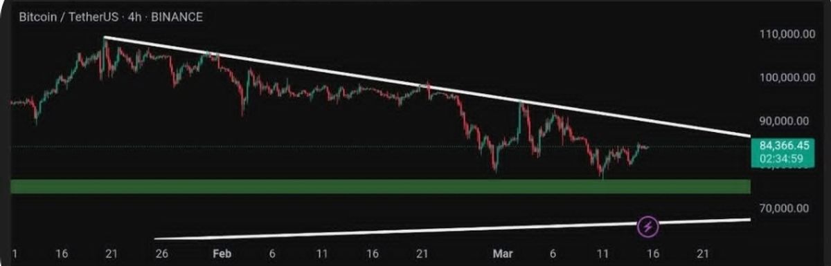 بیت کوین در تایم فریم ۴ ساعته در حرکت به سمت خط روند نزولی است و همانطور که در تحلیل قبل اشاره کردیم مقاومت این خط روند در محدوده ۸۸ الی ۹۰ هزار دلار است و درصورتی که بیت کوین موفق به شکست و عبور از این ناحیه شود میتوان انتظار رسیدن قیمت به سطح ۹۶۰۰۰ دلار را داشت. درصورت تداوم روند نزولی حمایت فعلی بیت کوین ناحیه ۷۶۶۰۰ و ۷۳۰۰۰ دلار میباشد