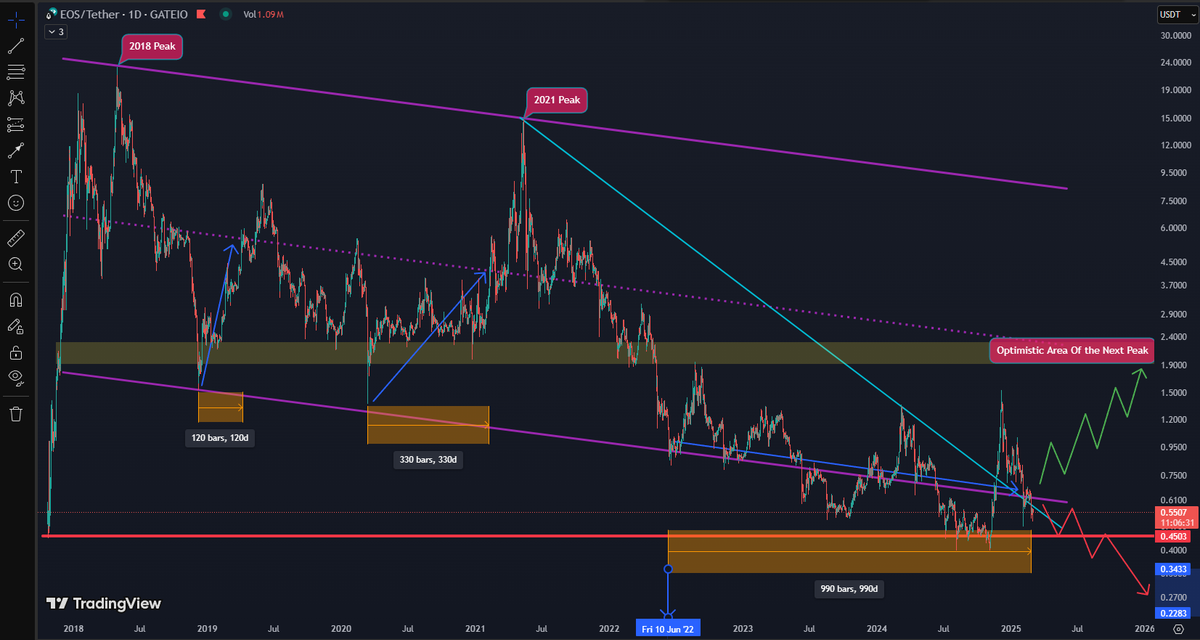 با بررسی گذشته ایاس در میابیم که قیمت دوبار به کف کانال نزولی رسیده بوده ولی بعد از صرف مدت زمانی کوتاه خودش رو ریکاور کرد و به میدلاین کانال نزولی رسوند منتها از وقتی که در حوالی ژوئن 2022 به کف کانال نزدیک شدش دیگه نتونسته ترکش کنه و فقط با کمی جهش موقت دوباره به سمتش متمایل شده این ضعف مشهود مومنتوم از طرفی قیمت رو به کف ابتدای قیمت نزدیک کرده و حتی باهاش برخورد داشته علاوه بر این یک ترند نزولی هم با خط ابی مشخص کردم که بازم قیمت نتونست بریکش کنه.حال با توجه به این نشانه ها بعیده که قیمت بتونه در بهترین شرایط از میدلاین فراتر بره و برای سوددهی دلچسب باشه لازم هست کسانیکه قصد ورود به این ارز رو دارن خیلی محتاط باشن .