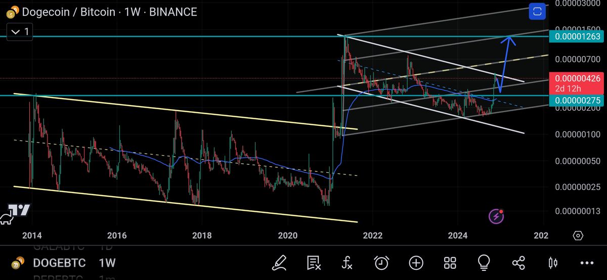 چارت بالا نمودار قیمتی دوج به بیتکوین از سال ۲۰۱۴ رو شاهدیم کانال اولی که در سال ۲۰۲۱ شکسته شد نمودار به اندازه عرض کانال بالا رفت و شاهد بولران دوج بودیم اکنون دوباره در کانال نزولی دومی رسیدیم به سقف کانال و در صورت شکسته شدن دوباره میتونه به اندازه عرض کانال بالا بره .حالا آیا میتونه و اگه میتونه تا کجا میره