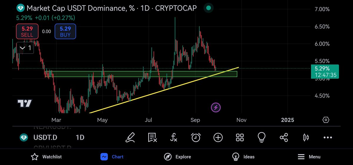 دامینسس تتر در تایم یک روزه درحال نزدیک شدن به گپ حمایتی و از طرفی درحال رسیدن به خط روند صعودیه خودش هست ینی محدوده ی 5.1%