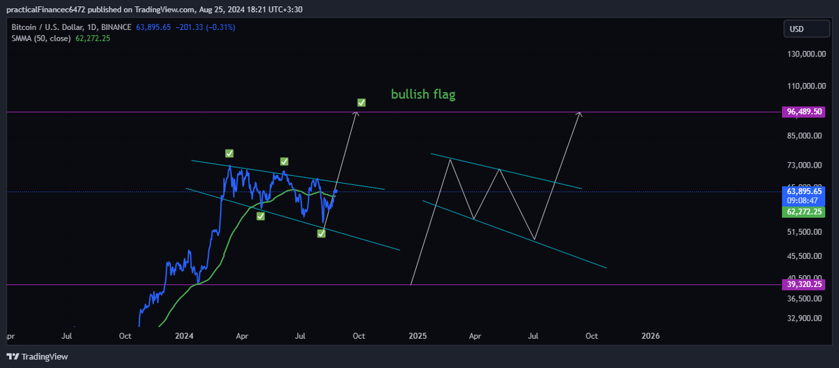 با سلام اگر برخی سقف و کف های اضافی رو در نظر نگیریم نمودار بیت کوین داره به وضوح الگوی bullish flag رو نشون میده در تایم فریم روزانه