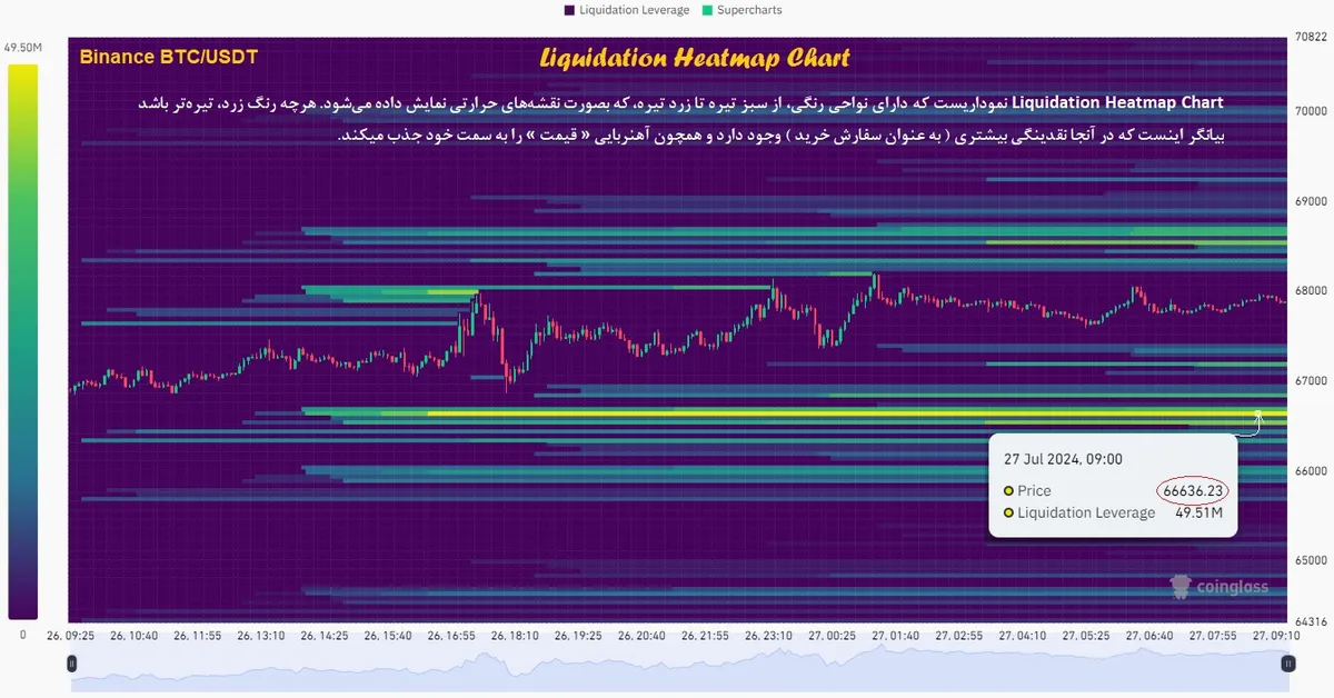بنابراین با یه نگاه به نمودار میشه فهمید که در ناحیۀ 66636.23 مقادیر زیادی نقدینگی وجود داره که قیمت رو به سمت خودش جذب میکُنه؛ در حالِ حاضر هم روند بیتکوین و به نوعی میشه گفت که نزولی کرده تا خریداران جدید بتونن وارد بازارِ بِشَن. پس این ناحیه میتونه یک ناحیۀ حمایتی خوب برای بیتکوین باشه.