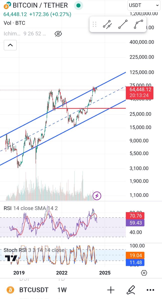 در تایم ماهانه مقاومت 31,800 دست نخورده باقی مونده و همچنین بیت مجدادا برگشته داخل کانال که لزوما باید محدوده کف کانال رو دوباره ببینه … بعد از تاچ محدوده 31,800 میتونیم الگوی صعودی بچینیم