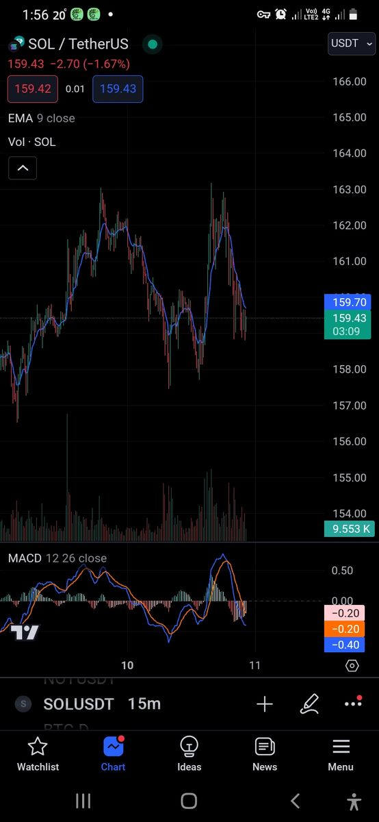سلام! بیایید نمودار ۱۵ دقیقهای ارز سولانا را بر اساس پرایس اکشن و اندیکاتورها تحلیل کنیم: