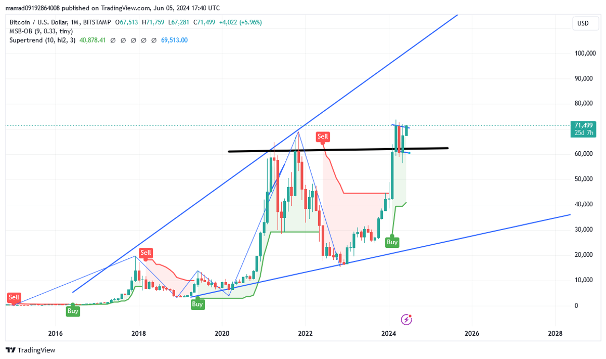 طبق تحلیل قبلی بیت کوین توانست کندل ماهانه بالای 62 هزار دلار ببندد و این یعنی ما در یک مسیر جدید قدم گزاشتیم و بیت کوین بشدت صعودی است و اما انتهای این روند در این ماه بنظر من بازه 95 تا 100 هزار دلار در خط روند ماهانه میباشد سیو سود در این قیمت ها شرط عقل است