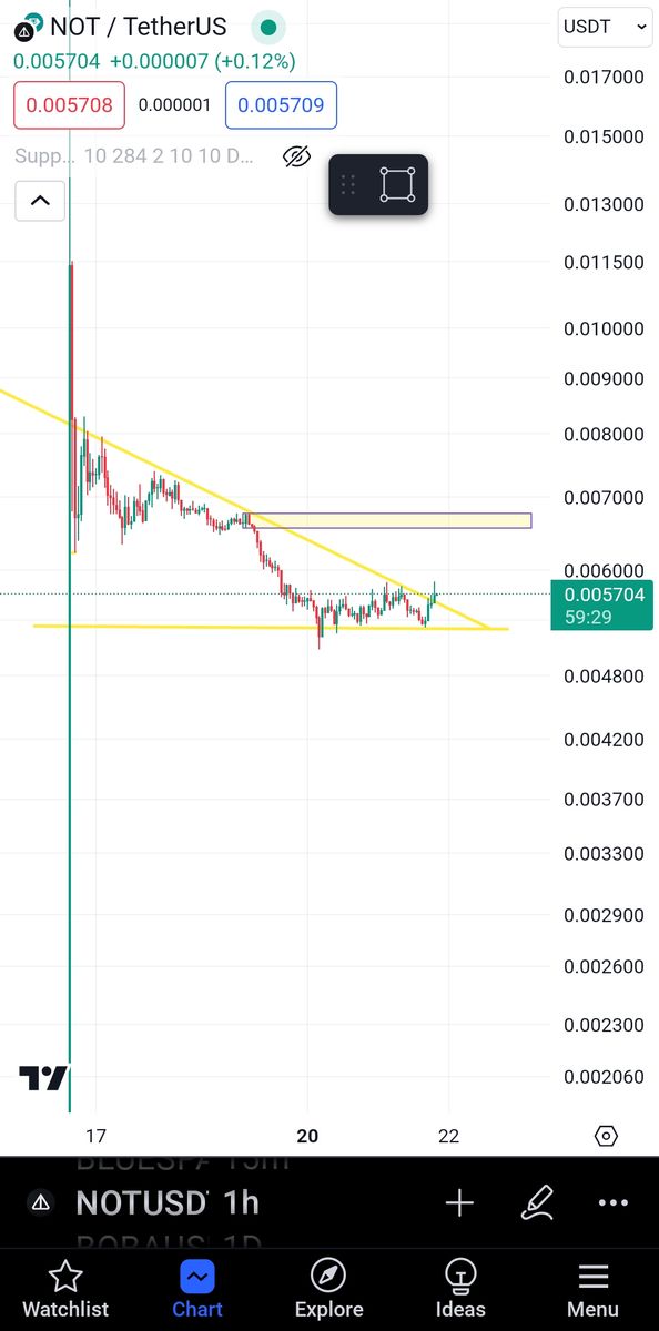 خط روند نزولی شکسته شده و از مثلث خارج شده میتونه تا محدوده ۰۰۶۶بالا بیاد تایم یکساعته