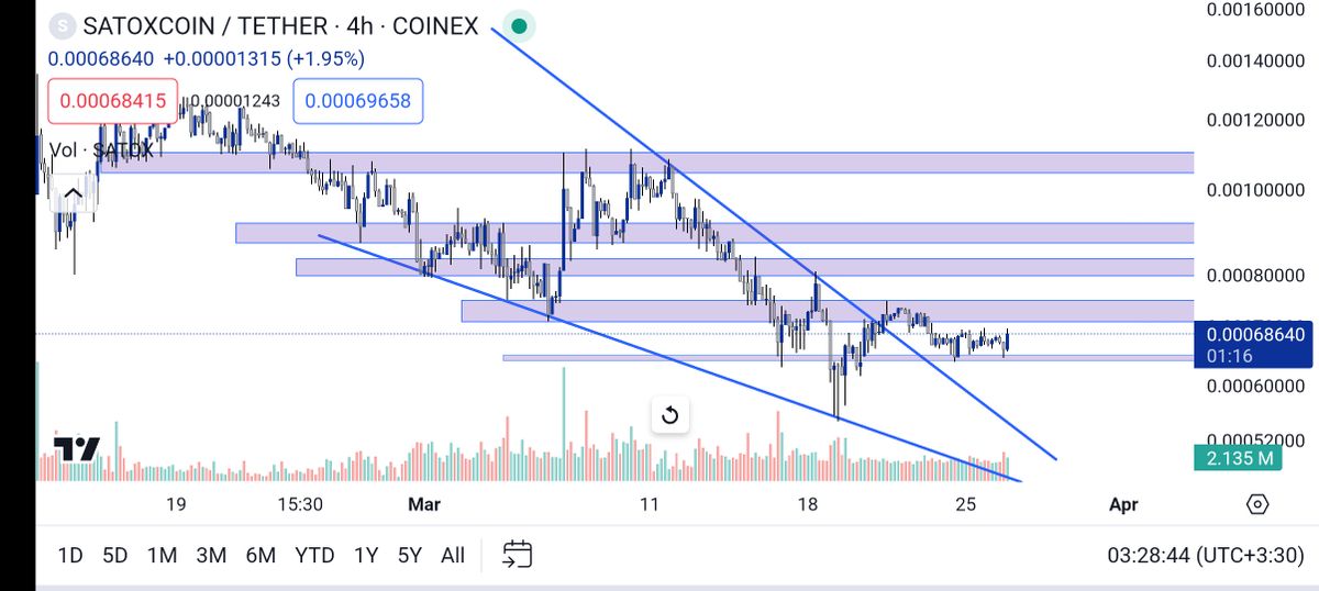 بنظرم سه تاییدیه برای خرید ارز ساتوکس میتونه کافی باشه یکی اینکه این ارز به کف حمایت رسیده دوم اینکه خط روند نزولیشو شیکونده سوم اینکه بالای الگوی کنج نزولی کلوز داده چهارم اینکه شاید واگرایی ه مثبت هم داده باشه که خودم شخصا الان یادم افتاد .ودیگه اینکه اینا همش تحلیل منه معیار خریدوفروش قرار ندید خدایی نکرده مدیون نشیم خودتون با تحلیل خودتون برید جلو ودیگه اینکه پله ای بخرید ومدیریت سرمایه رو رعایت کنید.