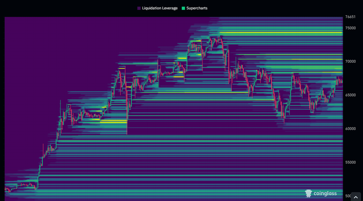 در این تصویر میزان نقدینگی موجود در نواحی قیمتی است. مقدار زیادی از نقدینگی در ناحیه 75 هزار دلار است.و به رسیدن به این ناحیه حدود 5 میلیارد دلار لیکویید میشوند. شک نکنید بازار به سمت نواحی نقدینگی حرکت خواهد کرد و این کار توسط مارکت میکر های بازار اتفاق میفتد.