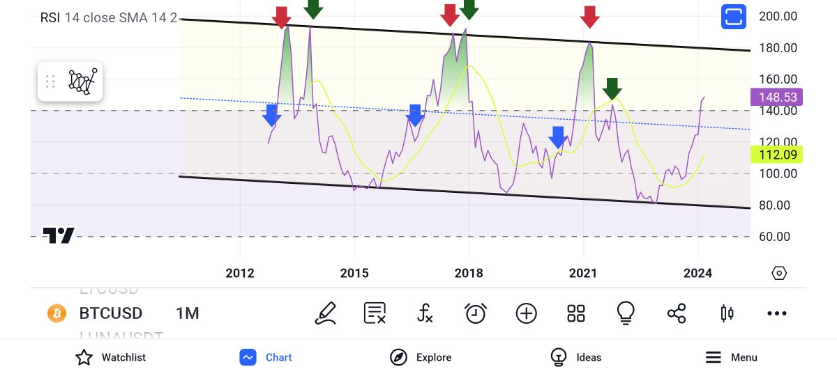 بنظر میرسد با توجه به سابقه سیکل های قبلی بیت موج ۳ تا انتهای رسیدن کندل ماهانه به سقف کانال شاخص قدرت نسبی ادامه داشته باشد و سپس اصلاح موج ۴ الیوت و در نهایت شروع موج ۵ صعودی… موفق باشید.(RSI)