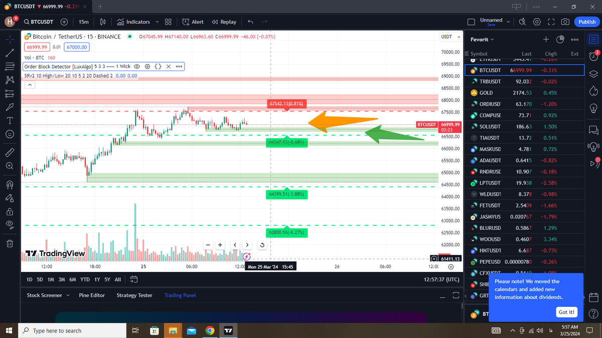 در تایم فریم های کوتاه که مختص معامله گران فیوچرز هست روند صعودی شکسته شده ولی خبر خوب اینه که اگر از به اف وی جی محدوده 67000 برخورد کند و با احتمال نفوذ به آن امکان جمع اوری نقدینگی بیشتر و جهش به سمت بالا روبرو شود . در صورت شکست این اف وی جی و ریزش بسمت اردر بلاک محدوده 66880تا 66650 و با شکست ان قطعا معامله شورت میگیرم . و اما اگر قصد بازکردن معامله لانگ دارید توصیه میکنم تا گرفتن سقف 67400 وارد معامله نشوید و پیش رویتان اف وی جی نزولی محدوده 67500 و دو اردر بلاک و یک مقاومت استاتیک پیش رو دارید که کمی معامله لانگ را ترسناک جلوه میدهد ولیکن اگر با کندل پرقدرت از این نواحی گذر کنیم تا ناحیه 69500 در دسترس خواهد بود