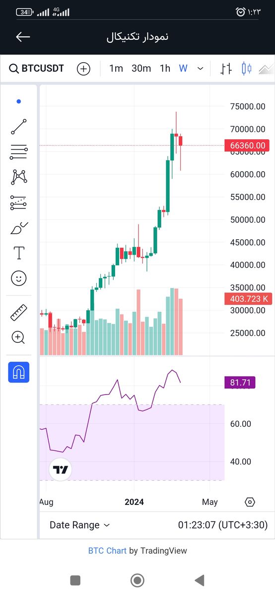 براساس داده نمودار وتحلیل کندلی ،درتایم فریم روزانه تایید کندل صعودی،ابتدا قیمت خودرا به ناحیه ۶۸۳۰۰رساندهوسپس در ادامه روند صعودی خود بااصلاح کندل هفتگی ابتدا قیمت به ناحیه ۶۲۳۰۰باز خواهد گشت وسپس با قدرت به سمت تارگت تاریخی ۷۱۴۰۰ودر پایان هفته تارگت دوم خود ۸۰۴۹۰دلار خواهد رسید.