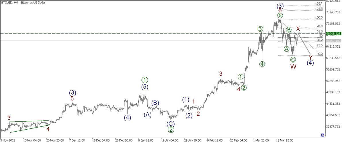 بازار BTCUSD باید دو موج فرعی نخست [1]-[2] از ایمپالس صعودی را کامل کرده باشد و قیمت در موج سوم، همراه با پایان یافتن امواج فرعی (1)-(2)-(3) در داخل، افزایش یابد. کورکشن (4) هماکنون به صورت یک زیگزاگ دوبل W-X-Y در حال آشکار شدن است. موج محرکه W به صورت یک زیگزاگ کامل شده است و موج پیوندی X باید قیمت را به سطح 68698.52، جایی که برابر با 61.8% از موج W خواهد بود، برساند.