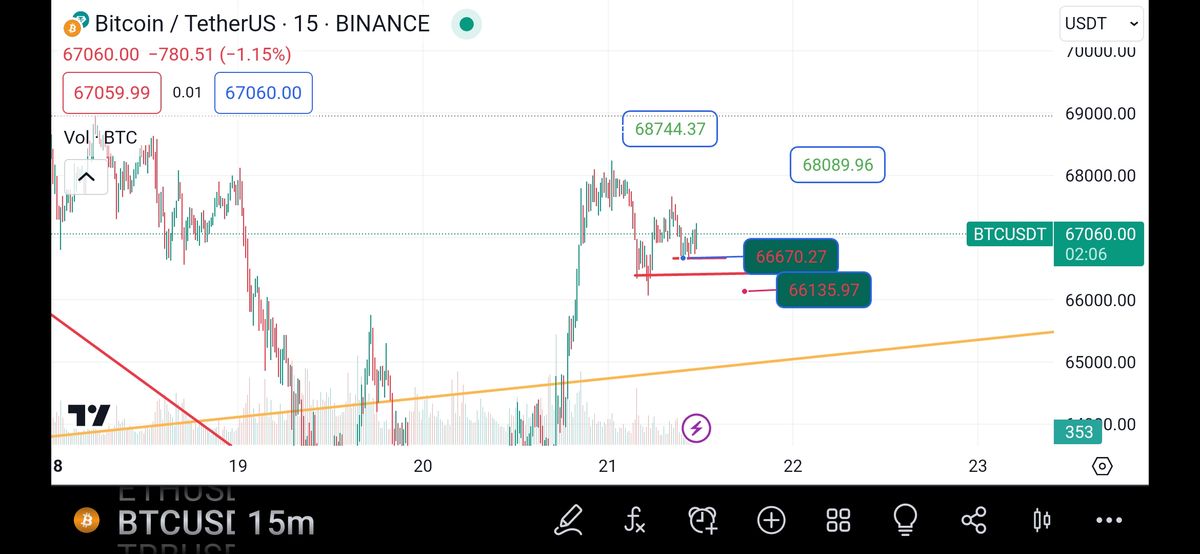 درحال حاضر از سقف ۶۷۱۱۵ گذر کردیم وبا دریافت سیگنال قطعی و عبور از آردر بلاک پیش رو تا منطقه ۶۷۵۰۰ دلار پیش خواهیم رفت و سپس منتظر عبور قوی و سیگنالهای قطعی برای گذر تا۶۷۷۰۰ دلار پوزیشن خواهم گرفت و تا۶۸۰۰۰ نیز در دسترس خواهد بود .