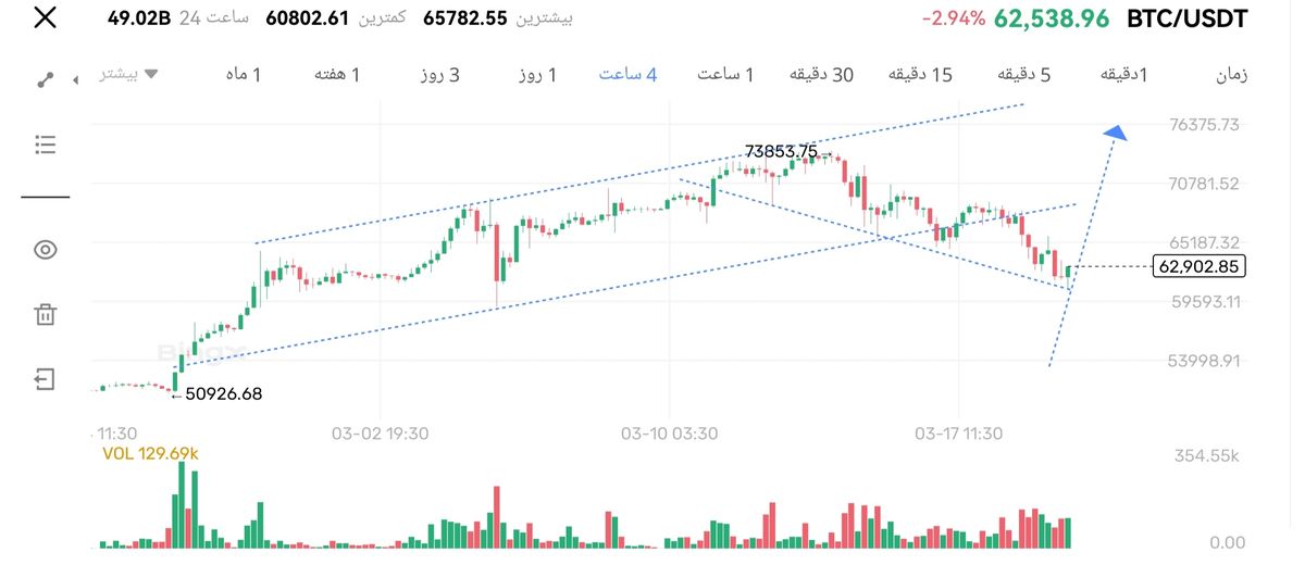 همانطور که گفته بودم اصلاح و روند نزولی بیت کوین تا جایی رفت که انتظارش میرفت و حالا از سطح 60 هزار حمایت شده و به بالا رفته ، طبق عکس اگر این خط روند به پایان برسد و به بالا حرکت کند روند صعودی در پیش میگیره ، اما اگر ناحیه حمایتی 60 شکسته شود باز هم انتظار نزول تا 58 هزار را دارد .
