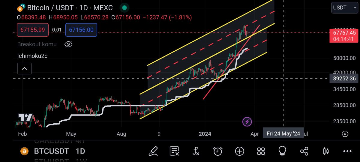 چنان که می بینید از کانال پایینی بیت رد کرده و به کانال بالاتر رفته و تا خط روند و روی خط پایینی کانال بالا رنج خواهد زد و در تقاطع بیا دو خط پامپ وحشناک بیت تا سقف کانال رو خواهیم داشت نفرین آمون بر بیت