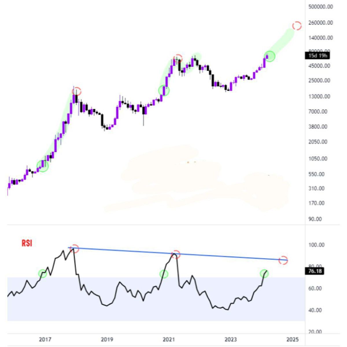 هر بار که RSI ماهانه از مرز ۷۰ عبور کرده، یک بولران عظیم را به همراه داشته است.
