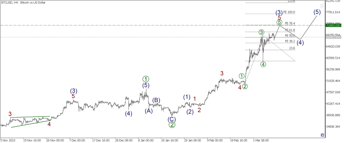 بیت کوین به احتمال زیاد در حال شکلدهی یک موج ایمپالس صعودی است که از امواج فرعی [1]-[2]-[3]-[4]-[5] تشکیل شده است. دو قسمت اول تا کنون شکل گرفتهاند. انتظار میرود قیمت بزودی در موج ایمپالس[3]، که از امواج فرعی (1)-(2)-(3)-(4)-(5) تشکیل شده است، افزایش یابد. آخرین قسمت موج فرعی (3) اکنون در حال توسعه است. انتظار میرود قیمت در موج فرعی 5 از (3) به سطح 72900.00، جایی که اندازه موج [5] برابر با 76.4 درصد از موج [3] خواهد بود، افزایش یابد.