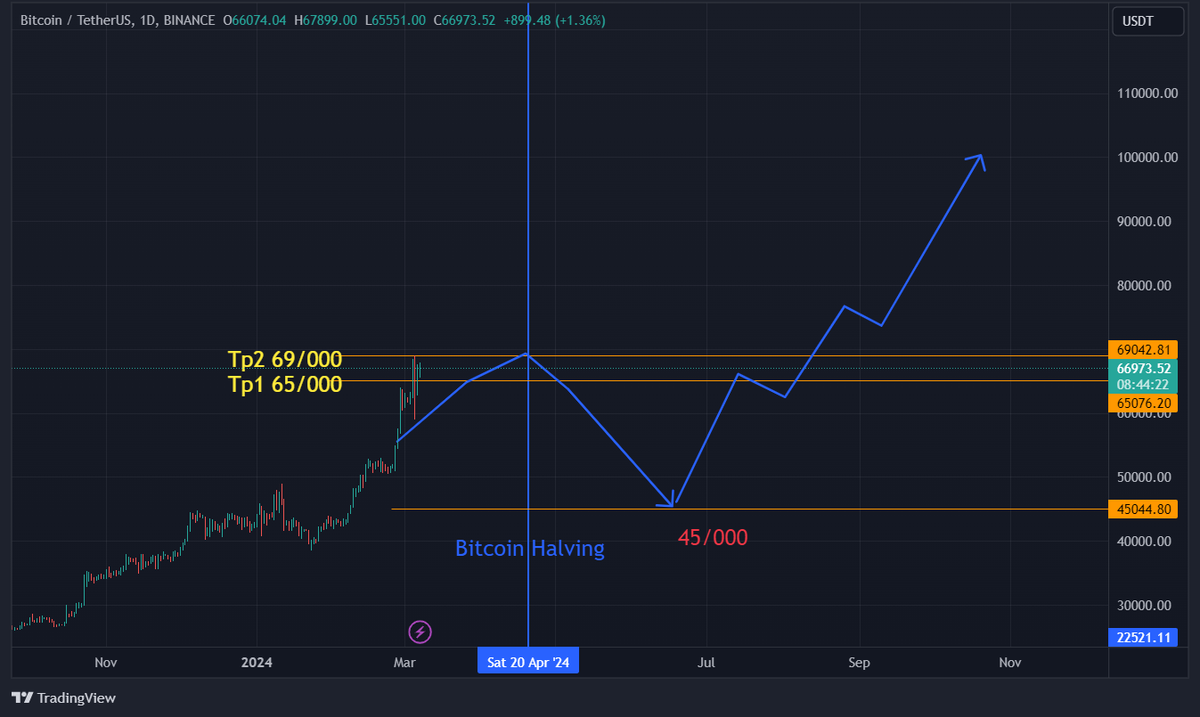 همچنان فکر میکنم بازار صعودی هست و بیت کوین میتواند با عبور از سقف قبلی خود به نواحی 72 الی 75 هزار برسد. همچنین در ماه های آینده (ماه های آخر سال) سقف 100 هزار دلار رو برای بیت کوین متصور هستم.