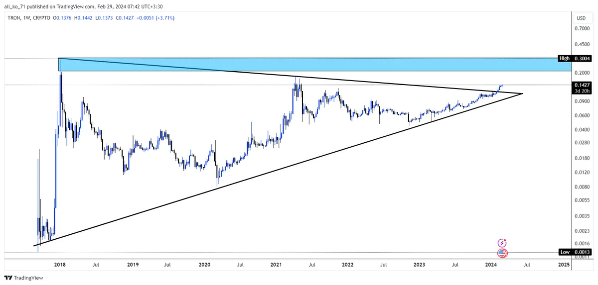 ترون بعد از 6 سال از مثلث خودش بیرون زد و بعد رد کردن 30 سنت به اعداد حداقلی 2-3 دلار خواهد رسید.