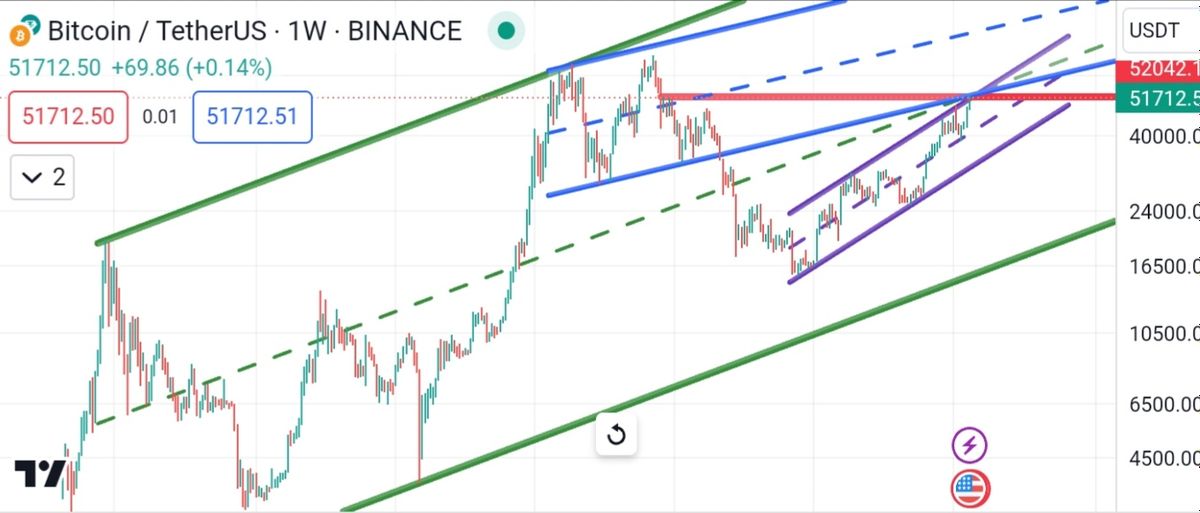 اگر بیت کوین بتونه این مقاومت بسیار مهم را رد کنه قطعا یک جهش صعودی بسیار قوی تا آخرین سقف خودش یعنی محدوده 69 تا 70 هزار خواهد داشت.