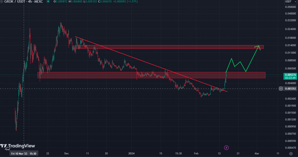 وقتی چارت قیمتی GROK بررسی میکنیم، اولین سیگنال خوبی که به ما میده خروج از روند نزولی خودش هست که قطعا سیگنال خوبیه. مورد دوم که باید خیلی برامون مهم باشه، قرار گرفتن قیمت درست زیر یک مقاومت مهم در محدوده ۰.۰۰۶۰ – ۰.۰۰۵۵ هست و برای ما به عنوان یک زنگ هشدار باید در نظر گرفته بشه که در حال حاضر برای خرید اصلا زمان مناسبی نیست.