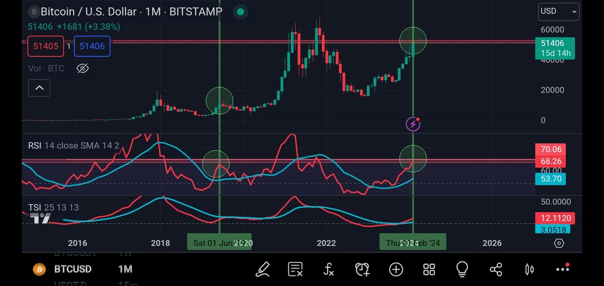 عدد ۷۰ شاخص قدرت نسبی یا همون ار اس ای خودمون ، به صورت مقاومت به کار رفته ، اولین ری اکشن این محدوده بر میگرده به سال ۲۰۱۴ که بعد از برخورد اصلاح در حد پولبک بوده ، از ان زمان به صورت مقامت اصلاحی به کار رفته ، یادمه تو سال ۲۰۱۹ دقیقا رو عدد ۷۰ برگشت ، الانم نزدیکشه ، من خودم بیت کوین رو عدد ۲۰ هزار دلار خریدم حالا فروشنده ام ، قیمت هایی که هم میفروشم هم سل شرت باز میکنم ، عدد ۵۱،۵۰۰ و ۵۲،۹۰۰ ، و در اخر ۵۳،۴۰۰ که سفارش سنگین میکارم تو عدد اخری ، به نظرم امکان نداره بدون کف سازی حرکت کنه ، اما در صورت اصلاحات در ماه هایه اینده من رو عدد هایه ۳۵،۰۰۰ هزار و ۳۲،۰۰۰ هزار دلار خریدارم . شاخص تی سی ای قدرت فوق زیاد روند رو نشون میده ، این بار ما محدوده ۳۰،۰۰۰هزار دلار رو نمیتونیم هانت کنیم چون خیلی قوی نشون میده فکر بیشتر ریختن رو از سرتون بندازین بیرون ، انشالله که اصلاح بده و دوستانی که جا موندن بخرن