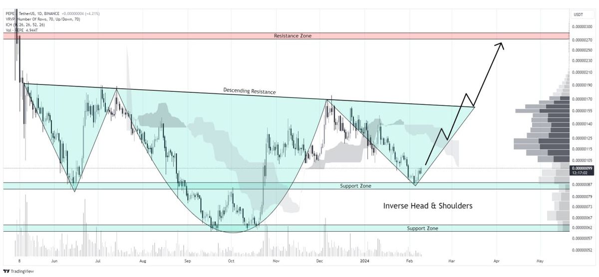 به علت وجود الگوی (سر و شانه معکوس) در نمودار قیمت PEPE/USDT، قیمت به نزدیکی حمایت کف رسیده است. این نقطه ورود خوبی به نظر میرسد.