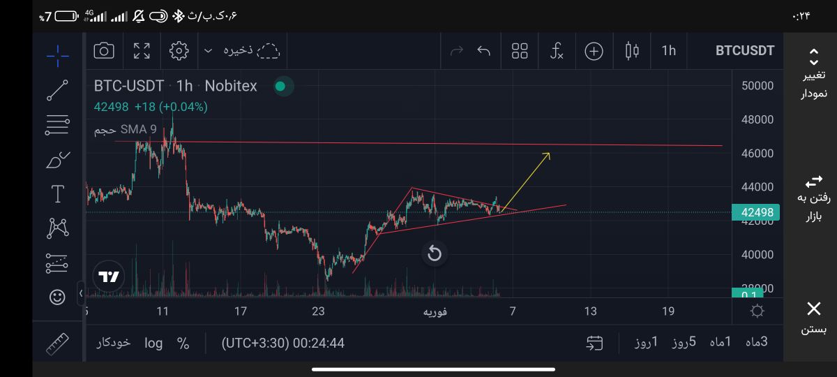 پرچم صعودی رو به بالا شکسته شد پول بک رو هم زد انشاالله شاهد صعود بیت بعد از یک ماه و نیم خواهیم بود رنج زدن باید تمام شود تا قیمت ۴۶ همراهش خواهیم بود و خروج نرسیده به ۴۶ و ریزش تا کف قیمت ۴۰
