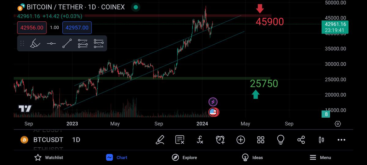 سلام دوستان امیدوارم در سود باشید ،احتمال زیاد قیمت دوباره به کانال برگشت داره و رنج میزند ورود به معامله سل روی قیمت45900 یا 46000 زودتر سل نزنید ،ناحیه 33هزارتا که رسید خودتون تصمیم بگیرید که خارج بشید یا ن ولی قطعا روی 26000 هزار بای بزنید خیال جمع