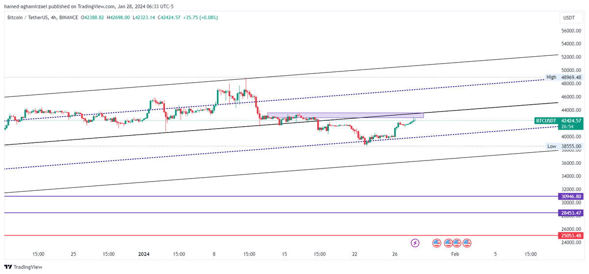 باید منتظر واکنش به این سطح باشیم.اگرر مجدد وارد کانال شد و سطح شکست میتونه سقف قبلی و یه سقف بالاتر بسازه و در صورت اصلاح اهداف 30الی 28 هزار.