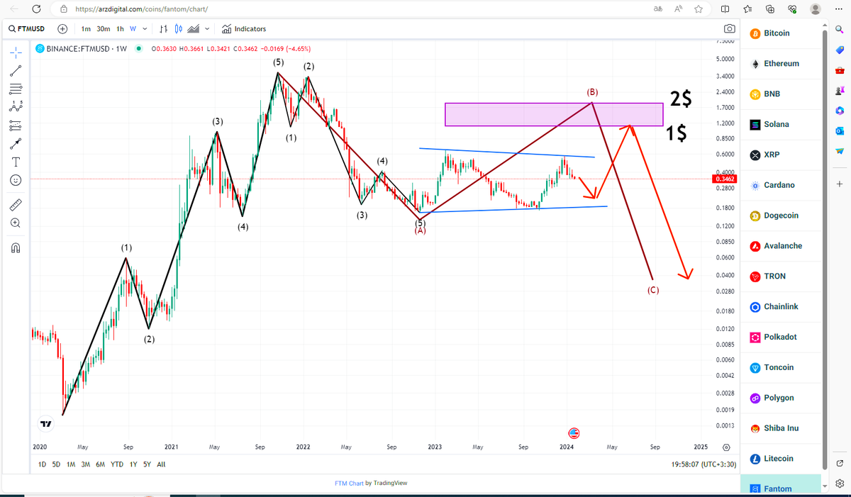همون طور که مشخص کردم ارز فانتوم پنج موج صعودی خودش رو تکمیل و بعد از اون وارد چرخه اصلاحی شده موج آ اصلاحی که به صورت ۵ موجی هست رو مشخص کردم واستون در حال حاضر در موج بی هستیم که تارگتش میتونه محدوده ۱ تا ۲ دلار باشه پس احتمالا به زودی رشدی رو داریم در این ارز بعد از اون به علت ریزش بیت کوین انتظار میره که همه ارزها از جمله فانتوم هم دچار ریزش شدیدی در قالب موج سی بشه موفق باشید
