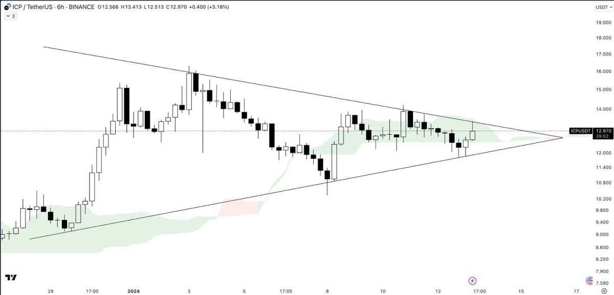 در یک الگوی مثلث متقارن در حال تجمع است. در حال حاضر، با مقاومت در مرز بالای این مثلث مواجه شده است. برای تعیین حرکت بعدی احتمالی آن، باید با صبر منتظر شکست موفقیتآمیز بالاتر از مقاومت یا شکست زیر خط پشتیبان باشیم.