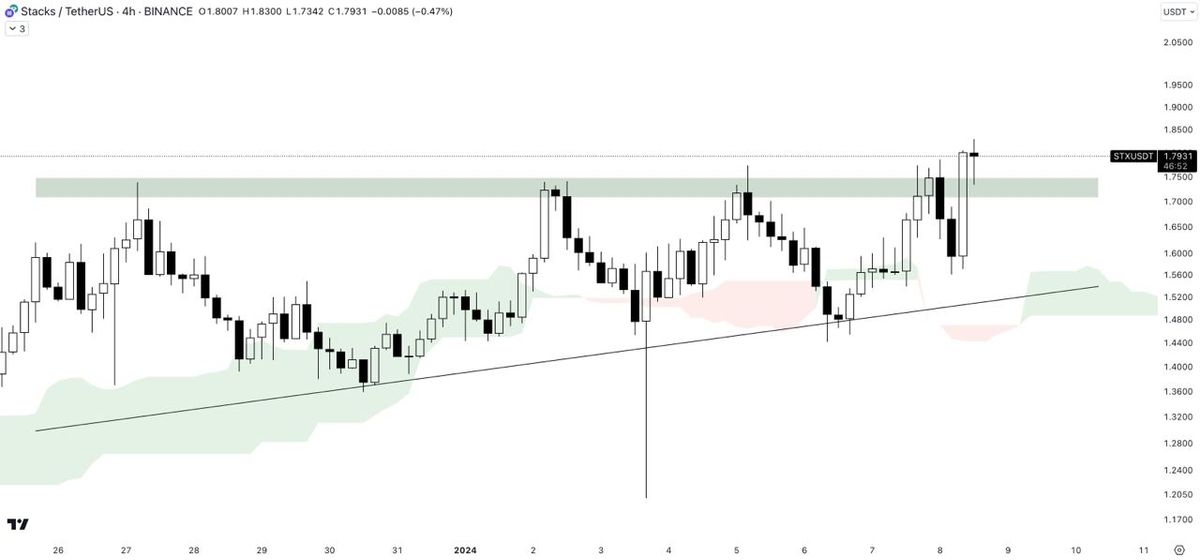 ارز استکس از مثلث صعودی خارج شده است و در حال حاضر در حال آزمایش مجدد بالای آن است. یک آزمایش مجدد موفق بالای مثلث یک روند صعودی را تایید می کند. زیر نظر داشته باشید