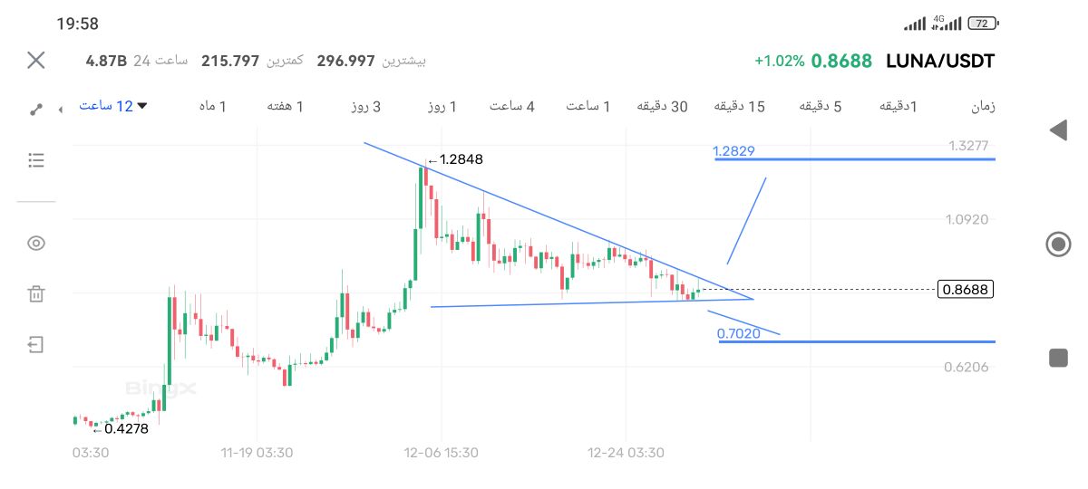 تایم فریم ۱۲ ساعته تو مثلث کنج نزولی قرار گرفته که از هر طرف