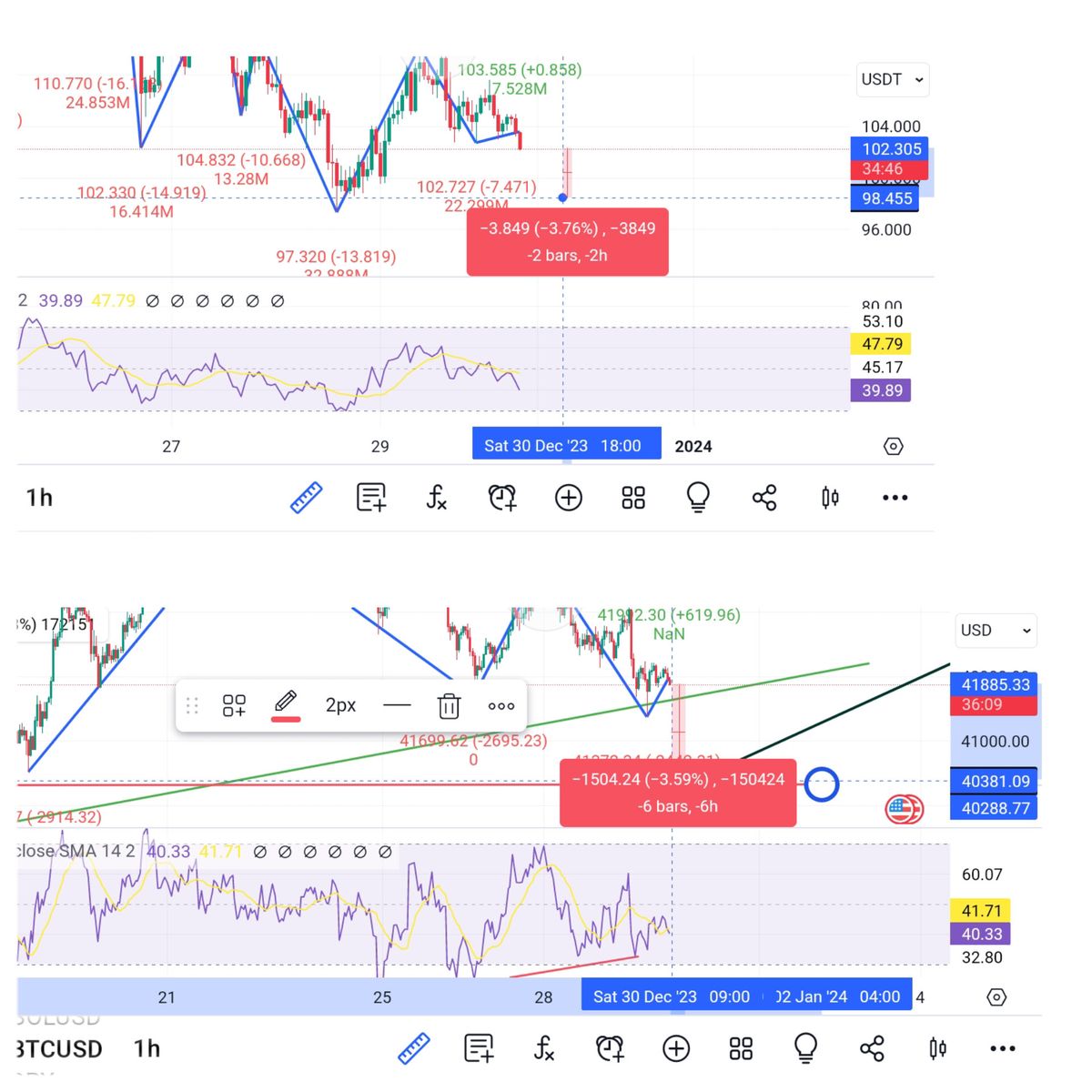 روند سولانا همسو با روند بیت کوین ناحیه حمایتی بیت کوین 40370 ناحیه حمایتی سولانا 98 دلار امروز هم روند ریزش شدت گرفته این سیگنال فروش خرید نیست
