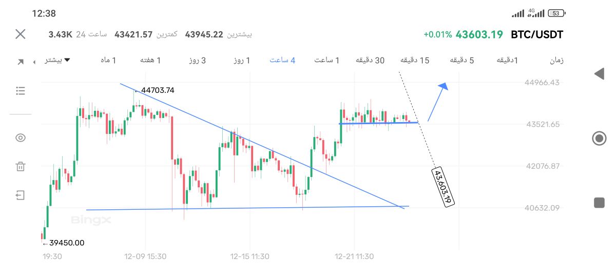 کاملا تو چارت مشخصه که در تایم فریم 4 ساعته مثلث رو به بالا شکسته و تثبیت هم داده