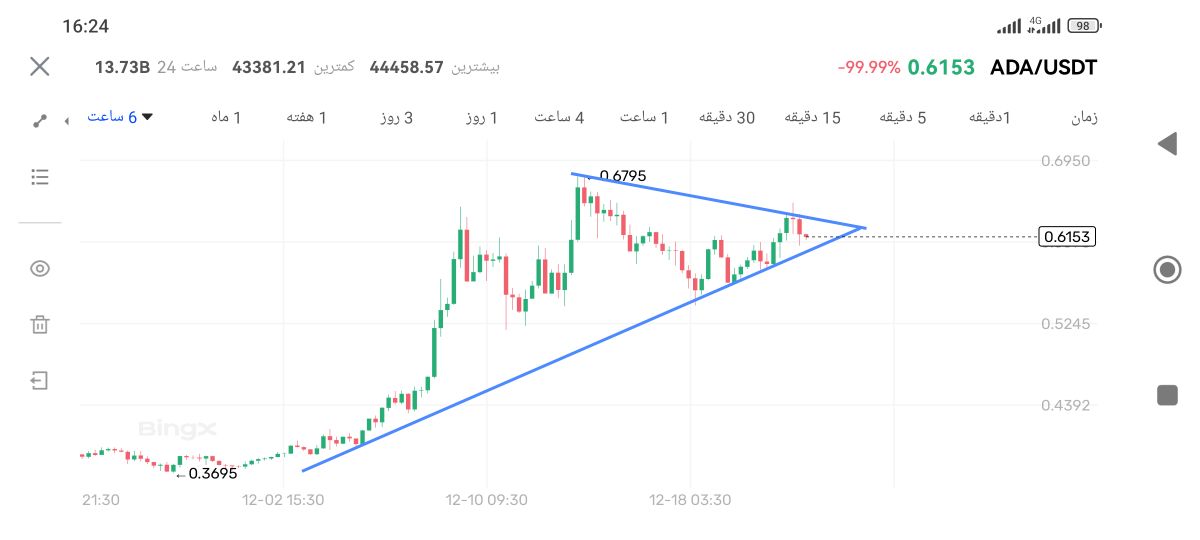 روند کاردانو کاملا صعودی هستش و الان درگیر مقاومتش هست که اگه اونو به بالا بشکنه تا 0.80 و تا 1 دلار می دونه صعود داشته باشه