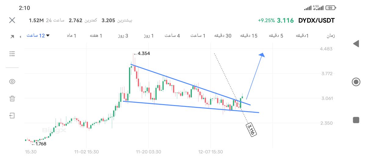 در تایم فریم ۱۲ ساعته الگوی کنج نزولی تشکیل داده و اونو از بالا شکسته و روندش صعودیه