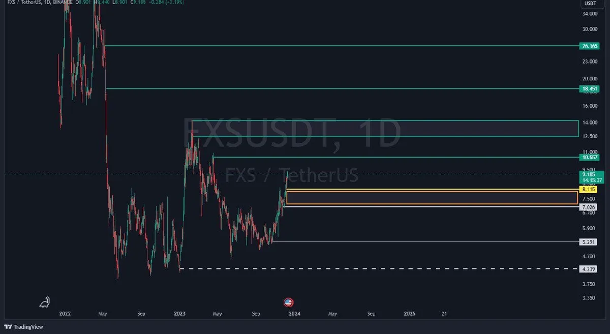 چارت تکنیکالی ارز FXS در تایم فریم روزانه در یک روند صعودی قرار دارد,ولی تقریبا به مقاومت مینور خود رسیده است,که در صورت عبور میتواند به محدوده 10.5 دلار برسد.از طرفی محدوده عرضه بزرگ و مقاومت جدی برای این ارز محدوده 12 تا 14 دلار(باکس سبز رنگ) است.