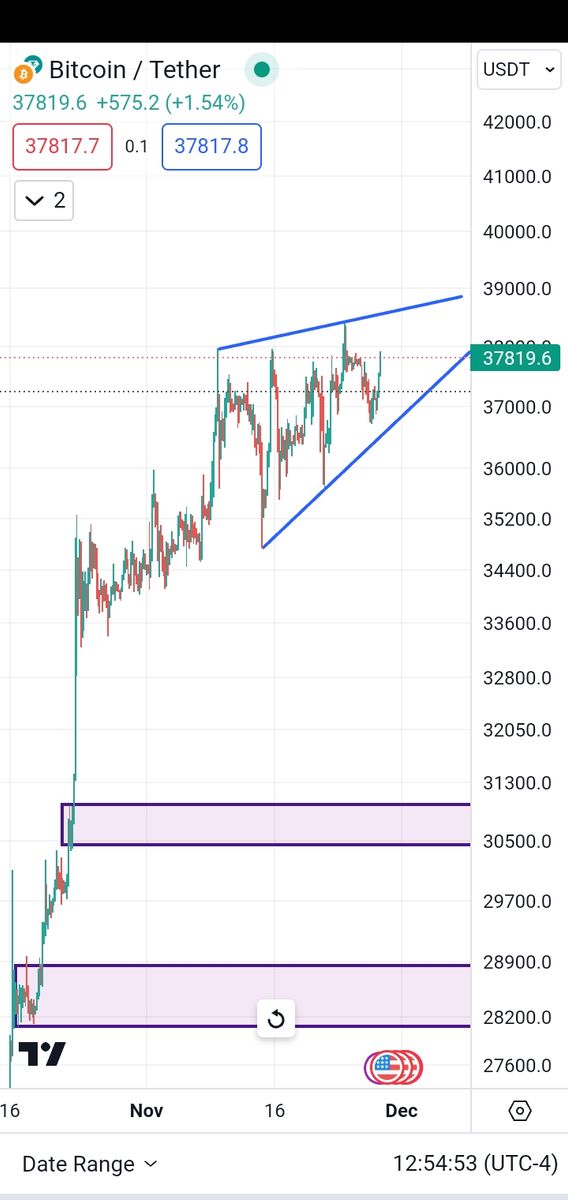 ثبت الگوی کنج نزولی تایم 4 ساعته در ناحیه مقاومت هفتگی. در صورتی که قیمت نتواند از خط بالایی الگو عبور کند و سقف جدیدی را به ثبت برساند و یا قبل از رسیدن به آخرین سقف روند نزولی در پیش بگیرد در مرحله اول تا ناحیه 30000 و در صورت شکست این ناحیه تا 28500 (نواحی مشخص شده در تصویر) ریزش خواهد کرد.