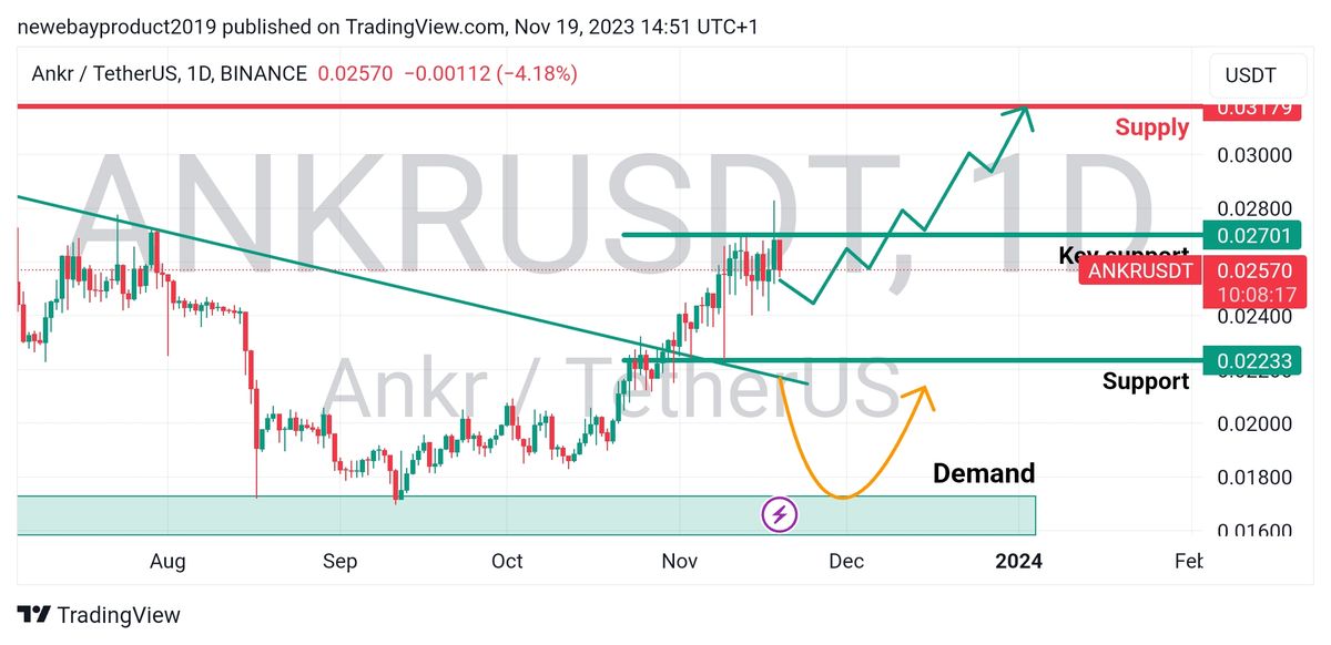 همانطور که در چارت مشخص هست خط روند و موینگ اوریج ۲۰۰ شکسته شده در چارت یک روزه افزایش پرایس تا محدوده ۰.۰۳۱۷۹ را شاهد خواهیم بود