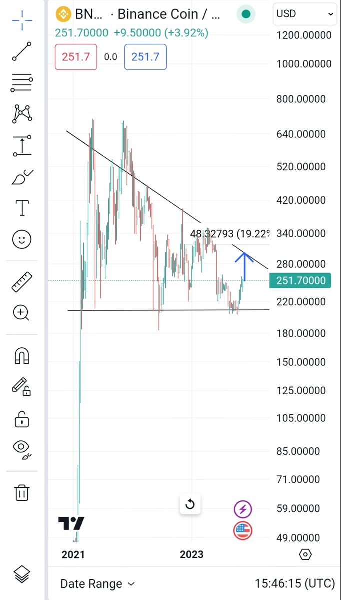 با سلام bnb تو چارت بلند مدت خودش در حال تشکیل الگوی پرچم خودش هست و در حال حاظر یه مقاومت سنگین تو محدوده ۳۰۰ دلار داره که انتظار میره بزودی بهش برخورد کنه