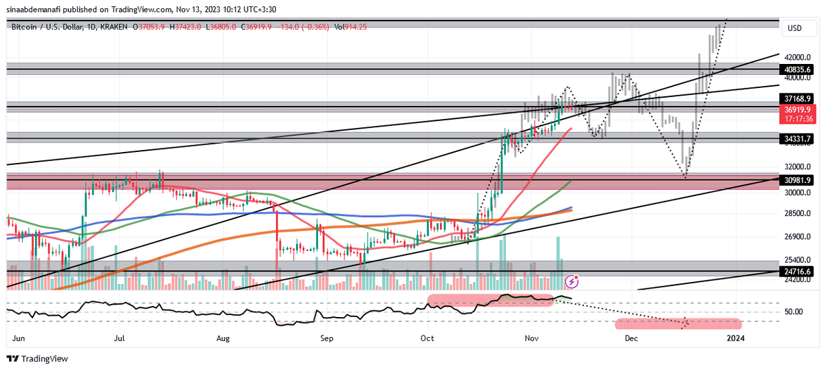بیتکوین نیاز به اصلاحی دارد و به نظر بنده این کار را در دو مرحه انجام داده و ابتدا تا حدود 34 هزار و بعد با بازگشت دوم حدود 31 هزار را خواهد دید ( مگر خبر ETF در این مدت اعلام شده که مستقیم به بالا حرکت میکند و بعد بازگشت میکند…)