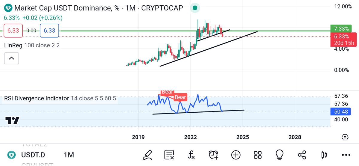 دوستان تتر نمودار دامینس تتربا توجه به اندیکاتور اراس ای داره روبه پائین حرکت میکنه. ریزش مساوی با رشدبیت کوین. همگی پرسود