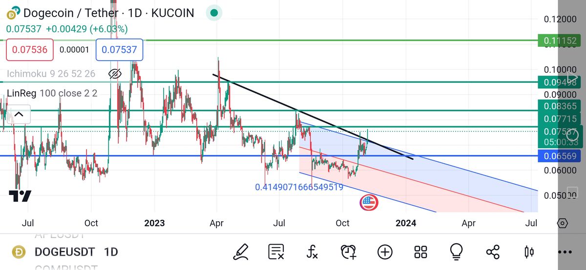 دوج کوین تو یک روند صعودی قرار داره احتمال زیاد با توجه به رفتار بیت کوین سقف های بالاتر تو روزهای اینده ببینه. همگی پرسود