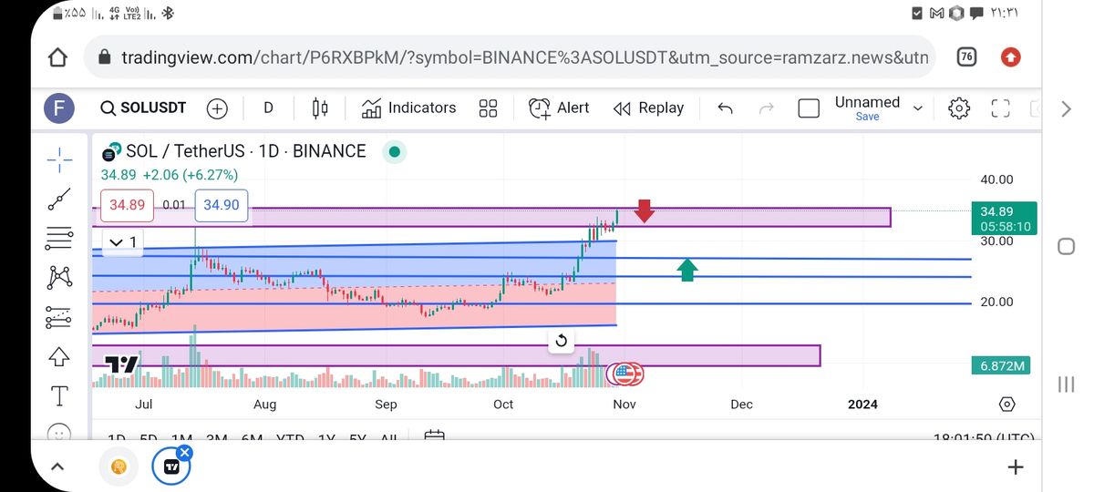 امروز تمام زور خود رو زده ولی فعلا از ماژور خود نتوانسته خارج بشه کندل فردا خیلی مهم بوده و ۱۰ آبان روز مهمی برای سولانا بوده فعلا نیازب اصلاح قیمت داره اگه فردا ی لحظه قیمت ماژور خودش رو شکست برای خرید عجله نکنید چون یا فردا ب احتمال ۹۹٪قیمت نزولی باشه و برگرده ب اصلاح قیمت موافق باشید کیف پولتوت پر