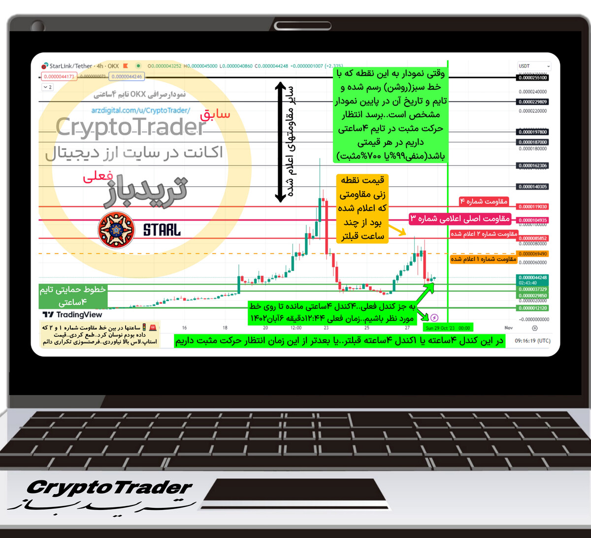 10 کندل 4ساعتی دیگه در زمان آینده………….استارلینک در هر قیمتی باشد…….چه 50درصد بالاتر چه 90درصد پایینتر…فرق نداره…………یک کندل 4ساعته سبز صعودی (پامپ در حد تایم 4ساعتی) خواهد زد……تاریخ فعلی نوشتن متن 8:54دقیقه صبح در 5آبان1402………….احتمال میدم با اون کندل…….مقاومت شماره.ی 3شکسته شود………………اگر تا اونموقع از ان مقاومت(مقاومت شماره 3) عبور نکرده باشد……اما قیمت بین 0.0000082 الی 0.000092 در نوسان باشد.